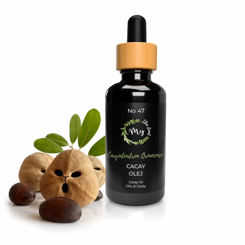 Cacay olej obsahuje velké množství přirozeně se vyskytujícího retinolu, u kterého bylo klinicky prokázáno, že redukuje vrásky, zvyšuje produkci kolagenu, podporuje regeneraci buněk a doplňuje kožní tkáň, čímž prokazatelně snižuje výskyt vrásek a zároveň udržuje pokožku hladkou a pružnou. Cacay olej je navíc bohatý na antioxidační vitamin E, který chrání pleť před škodlivými účinky volných radikálů, jež jsou hlavní příčinou stárnutí. V tomto novém oleji je také obsaženo vysoké množství esenciální mastné kyseliny omega-6, kyseliny linolové, která je známá pro své intenzivní vyživující a hydratační účinky na pokožku. V tradiční medicíně mnoha amazonských komunit se tento olej používá k léčbě různých kožních onemocnění, včetně akné, ekzémů, suché pokožky, lupénky, hojení řezných ran a mnoha dalších.