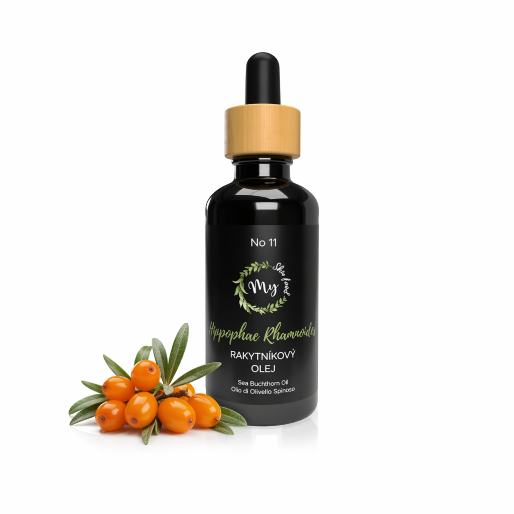 Hydratační prvek a hojivé složky rakytníkového oleje mohou pomoci rychle zklidnit spáleniny od slunce a působit na rychlé odstranění podráždění. Prokázal určitou schopnost blokovat UV záření. Říká se, že je největším rostlinným zdrojem vitamínu C. Obsahuje vysoké množství vitaminu E, nenasycených mastných kyselin, esenciálních aminokyselin a betakarotenu. Zlepšuje metabolismus pokožky a zpomaluje její stárnutí. Bohatý je též na betakaroteny, tudíž je velmi vhodný po opalování.